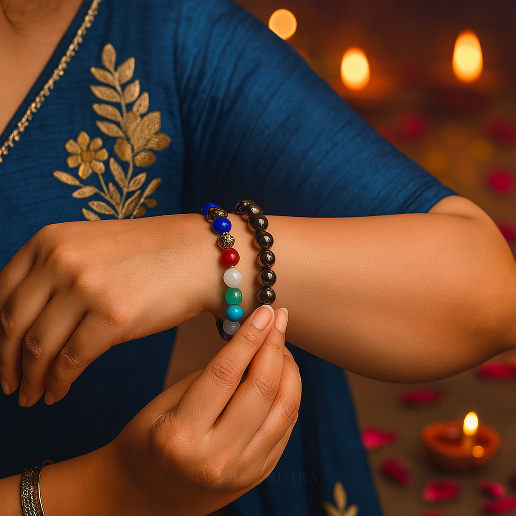 The Money & Health Combo features the Seven Chakra Bracelet for holistic healing and energy balance, paired with the Golden Pyrite Bracelet to attract wealth and success. Together, they help align your energy and finances—promoting both well-being and prosperity.